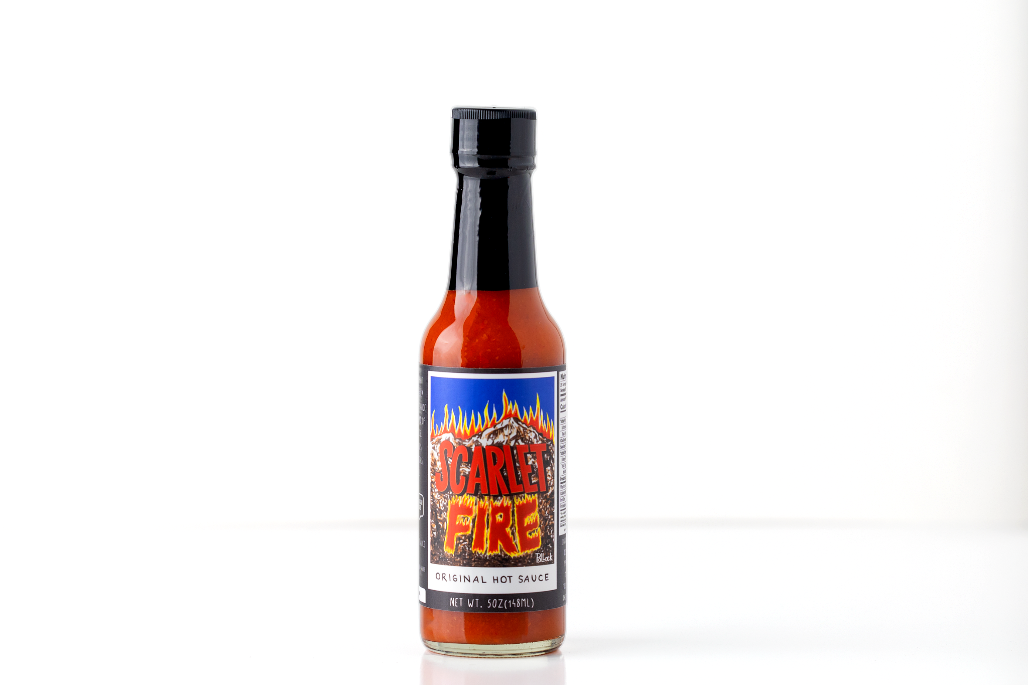 The perfect blend of heat and flavor, Scarlet Fire® is a medium-heat sauce made with a puree of Fresno, habanero, and Thai chili peppers - with vinegar, garlic, and carrot for a touch of sweetness. Made from the highest-quality, non-gmo ingredients. Gluten free, vegan, no added sugar or preservatives. Original artwork by Jim Pollock.
